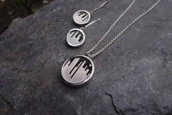 This Celtic Knot pendant by Miriam is available only on Baileo. There are two sizes (regular and petite) along with stud or drop earrings. A lovely unisex design. Read the story behind the artist and the design here.