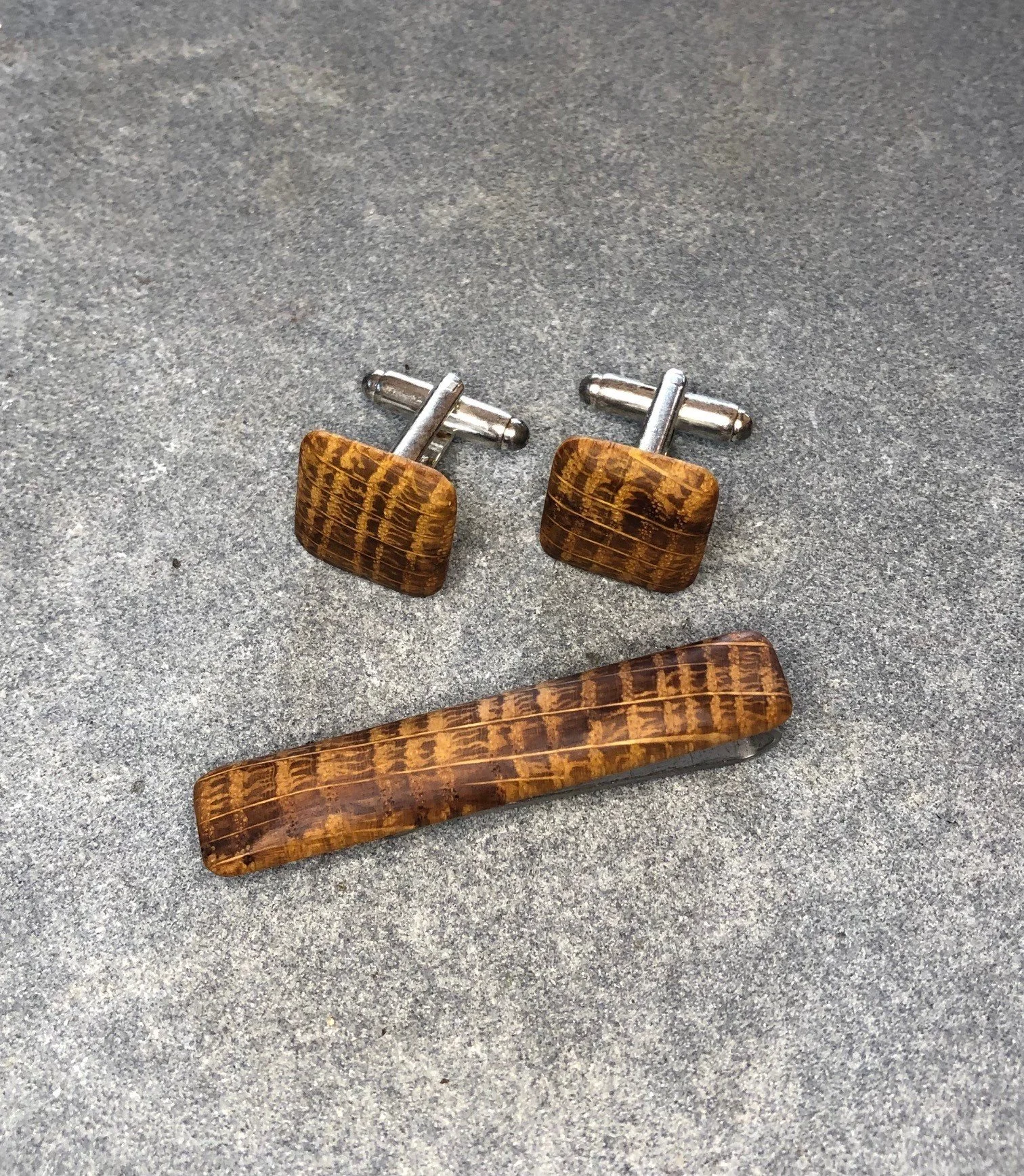 The Whiskey Barrel Cufflinks and Tie Clip started life in the USA where the oakwood barrels matured and stored the finest bourbon before crossing the Atlantic to Ireland. There they began the next stage of their journey: storing Irish whiskey. After many years of maturing whiskey, the barrels developed a unique and beautiful stain. Greg Piergrosse in County Fermanagh has lovingly recycled the whiskey barrels to create unique pieces of wood art.