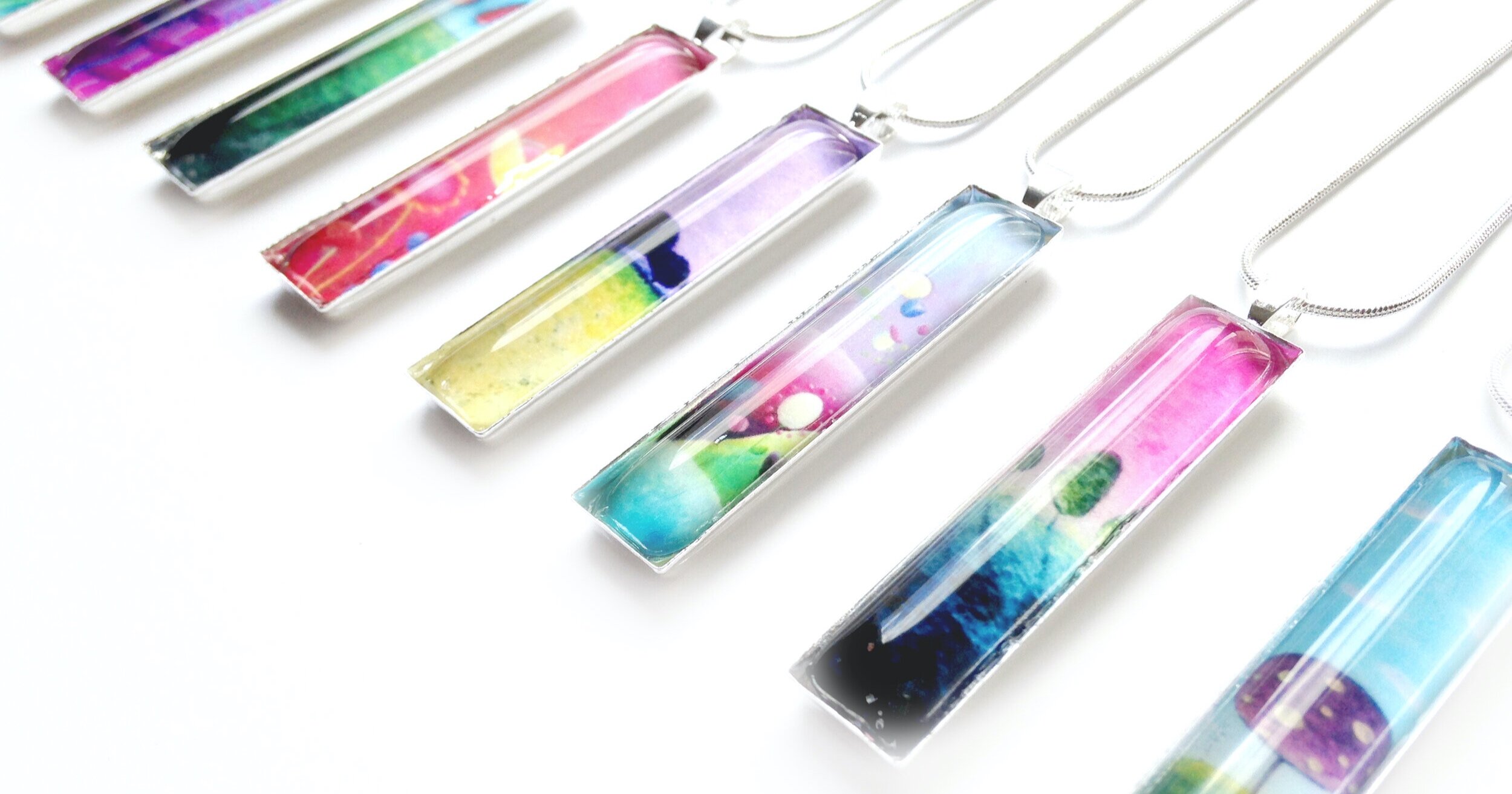 “Playing with colors is a huge part of my work as an artist, and I love that it translates so well onto a piece of jewelry. The fact that the jewelry pieces are featuring my own images is unique in itself, and the glass on top of the image makes it look like a miniature window looking into some imaginary world.”